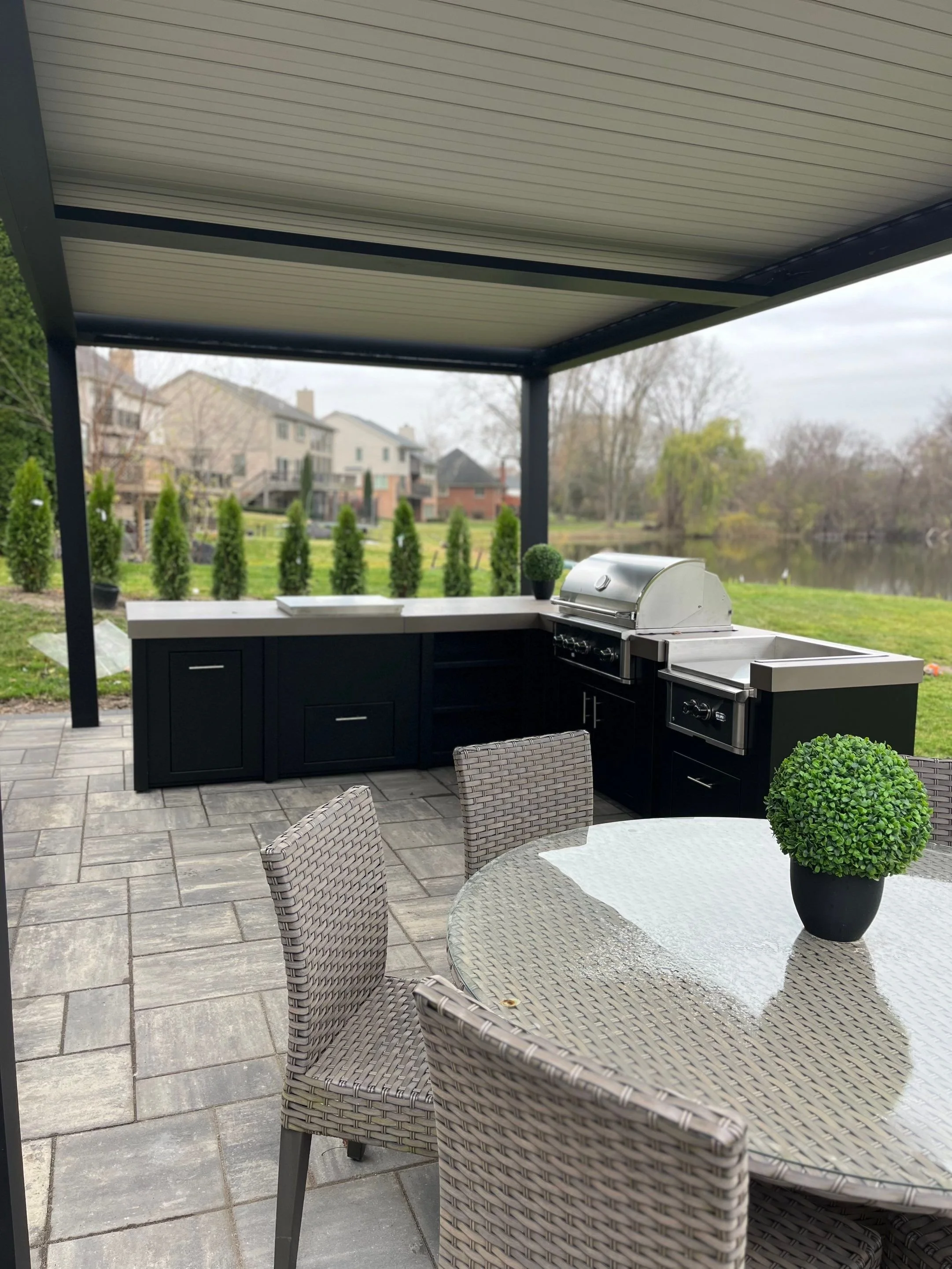 Once installed, the kitchen can be finished off in a few different ways. For clients who want a built-in appearance, we’ll typically custom-build a border of pavers or stone around the base. This helps create the impression of a custom build. Additional hardscape elements can be added as well, such as a bartop area or covered pergola or pavilion.